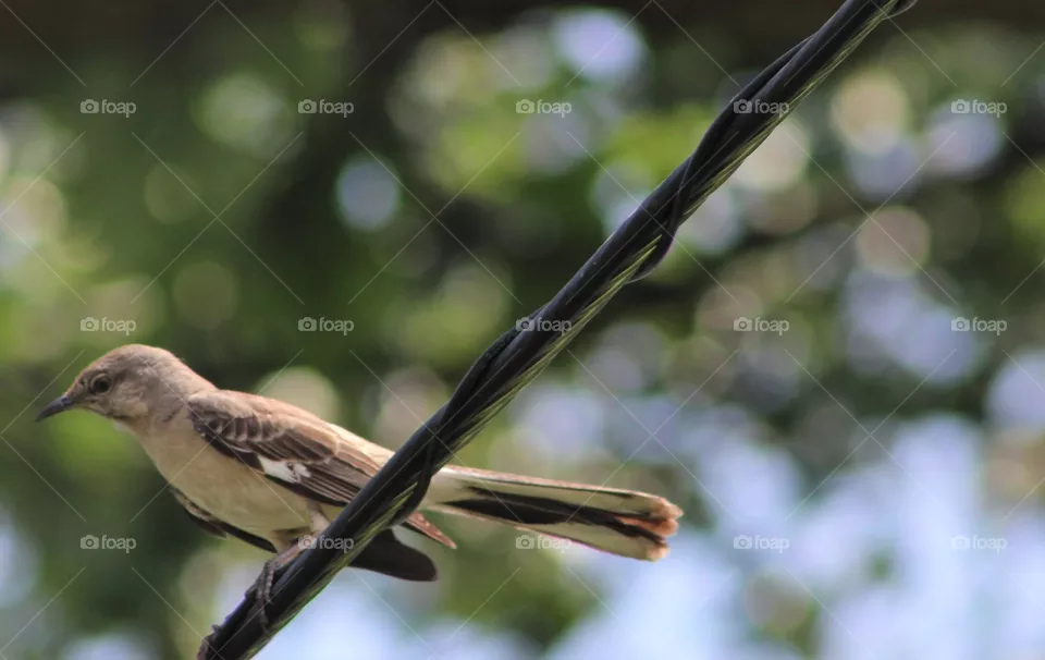 Stock photo: Alert Northern mockingbird perched on wire with greenery in background on June morning was taken by dmaxey .