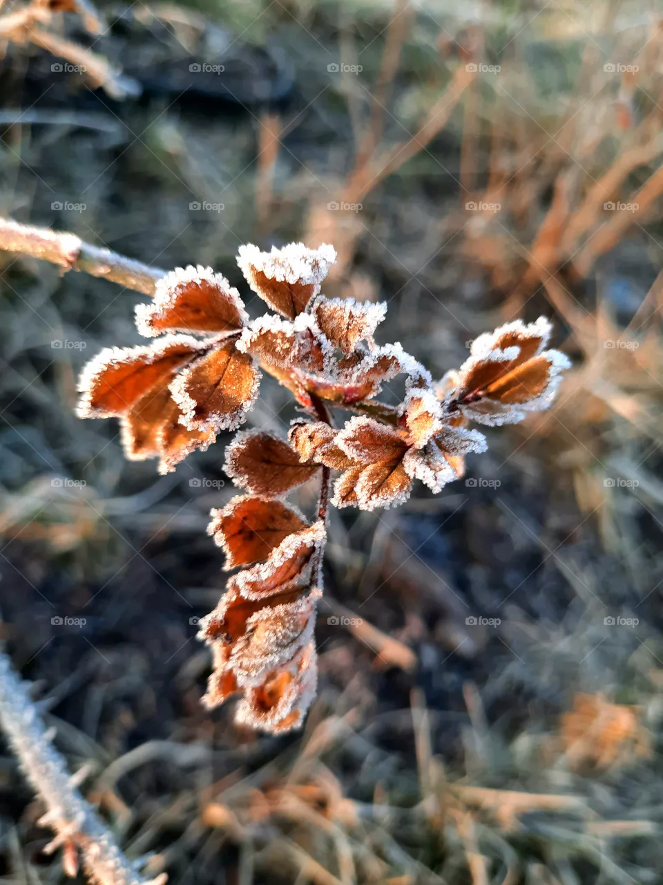 frost covered dry leaves of a rose in morning light