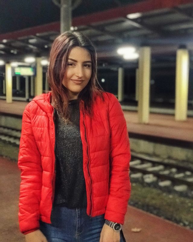 Girl in winter fashion looking in the camera: scarf, hat