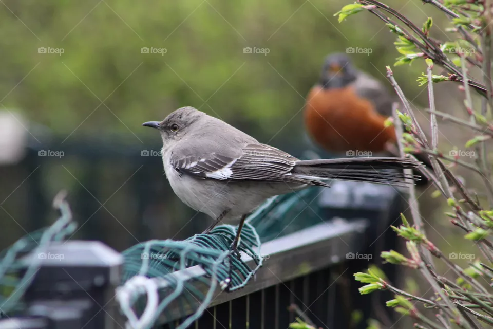 Stock photo: Northern mockingbird on fence with American robin in background was taken by dmaxey .