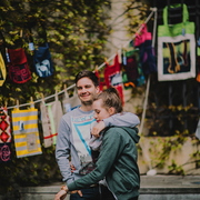 couple in front of green wall