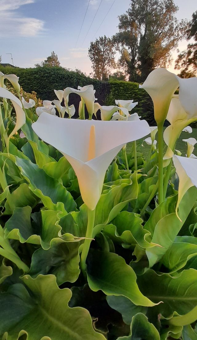 Calla lily with sunset Northern Ireland summer garden and beautiful sky at summertime