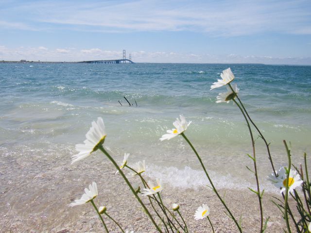 Mackinaw bridge on Lake Superior with flowers