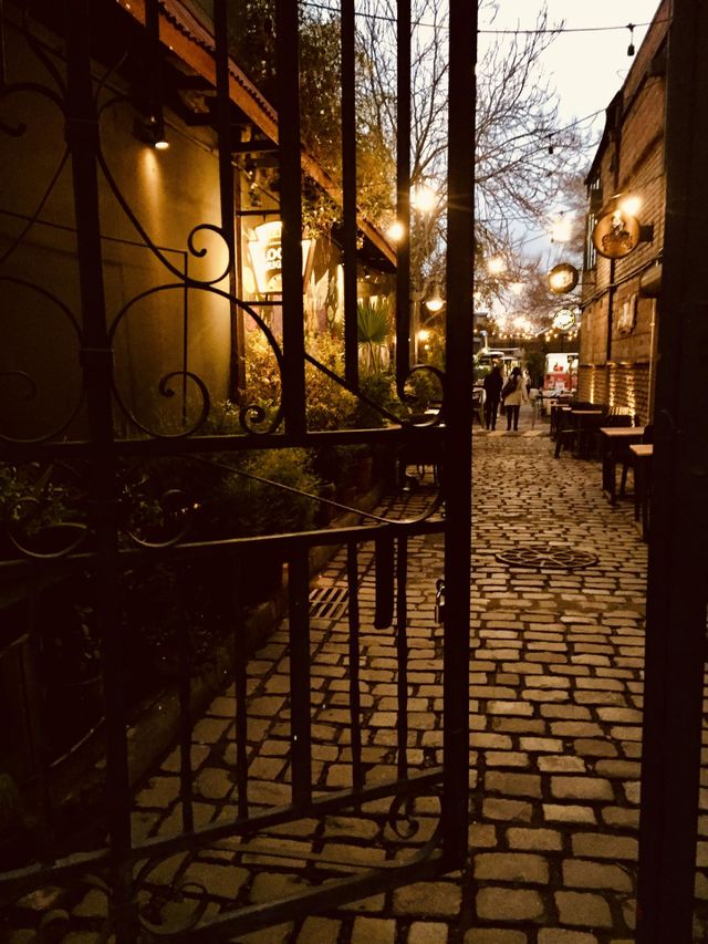 Passage through metallic door into cobblestones paved road in Providencia, Santiago, Chile by night