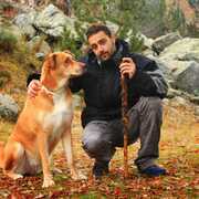 Perro paseando por la montaña