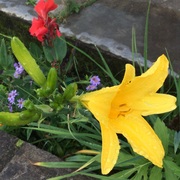 Beautiful red and magenta colored flowers sitting in early afternoon sunlight in an outdoor courtyard in Xela, Guatemala.