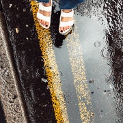 Female feet with red toenails in bathtub with beauty products and granta literary journal
