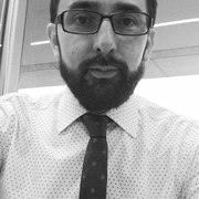 Selfie. Blue sky and self-portrait with high contrast. Beard, glasses, blue.