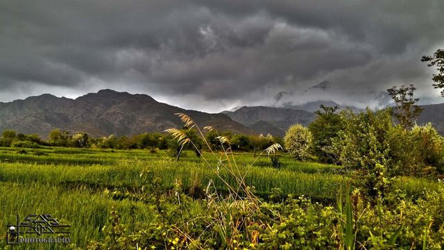 green fields and snow fall mountains